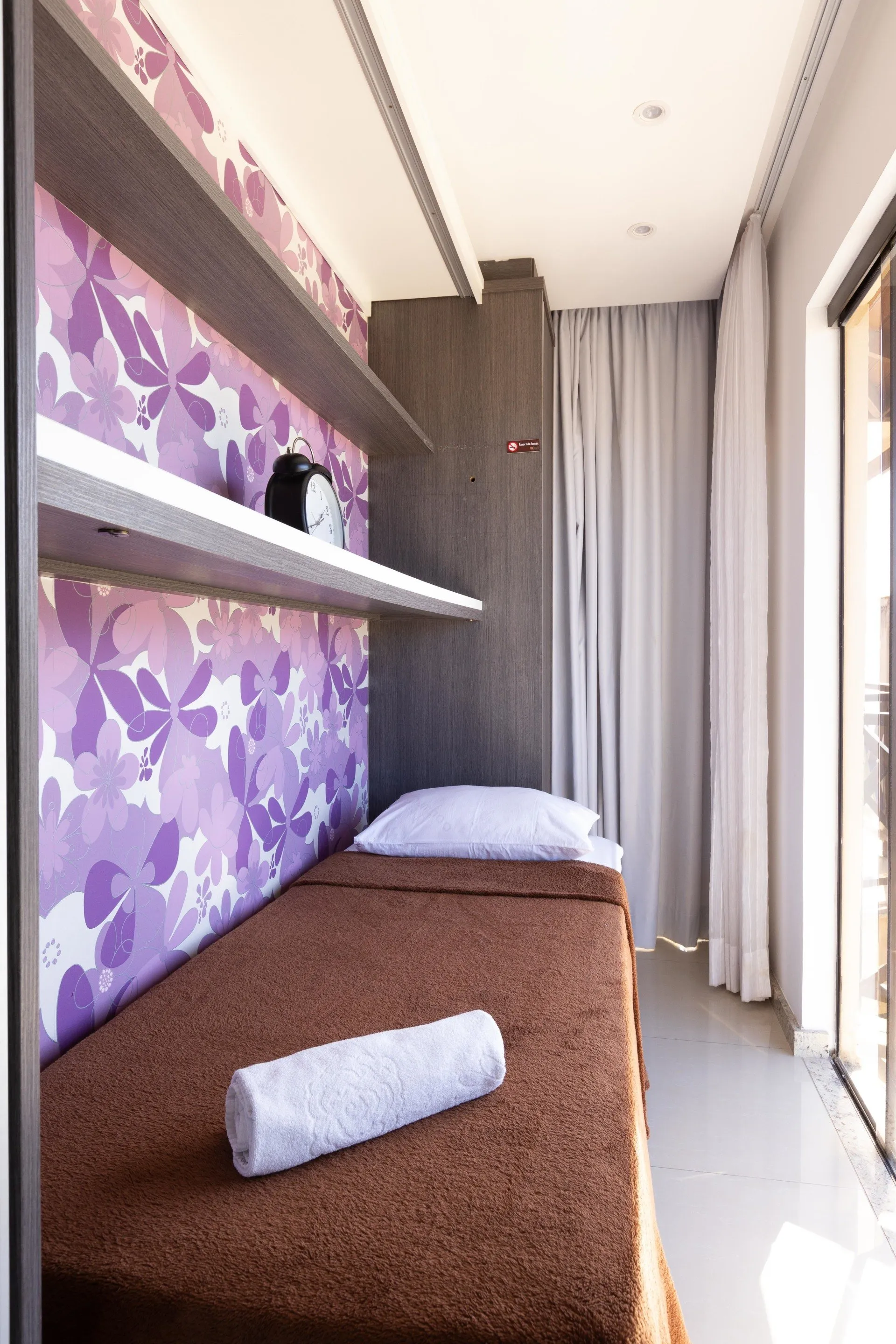 Apartamento Cobertura com 2 dormitórios sendo 1 suíte para casal com cama queen + 01 cama box solteiro + 01 quarto com 1 cama box solteiro.